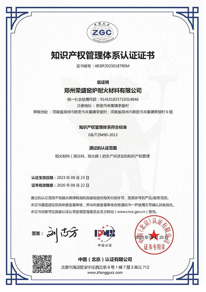 近日,鄭州榮盛窯爐耐火材料有限公司(以下簡稱「榮盛耐材」)順利通過知識產(chǎn)權(quán)貫標(biāo),并獲得了《知識產(chǎn)權(quán)管理》中英文雙語。該項(xiàng)的順利通過,標(biāo)志著榮盛耐材構(gòu)建了一套規(guī)范化、系統(tǒng)化、程序化、精細(xì)化的知識產(chǎn)權(quán)管理。