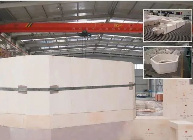 其產品優(yōu)點為:①使用了電熔氧化硅結合相,不含氧化鈣成分,二氧化硅含量可達98.5%以上;②密度更小(1.8g/cm3),降低了整個大碹的重量;③價格相比同級別電熔材料更低;④比硅磚具有更低的膨脹系數(650℃時0.6%)、更高的使用溫度(T0.5為1690℃);⑤更好的體積穩(wěn)定性。在國內某全氧燃燒窯爐上有使用經歷,但大碹出現威脅到窯爐的變形問題。