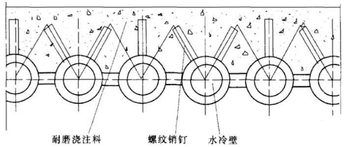 如圖1所示,為循環(huán)流化床鍋爐燃燒室下部水冷壁管上耐磨澆注料的施工工藝,耐磨材料是由焊在管子表面上的金屬銷釘固定。由于該區(qū)域?yàn)槿紵蚁虏棵芟鄥^(qū),其物料濃度很高,混合及湍流流動(dòng)非常強(qiáng)烈,所以磨損非常嚴(yán)重。為了防磨,在下部密相區(qū)須襯有一定厚度的耐火、耐磨澆注料。
