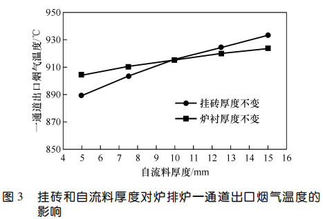 2、對于掛磚+自流料爐襯,掛磚厚度不變時,自流料厚度越大,一通道出口煙氣溫度越高;爐襯總厚度不變時,掛磚越厚、自流料層越薄,一通道出口煙氣溫度越低;爐襯各工作層厚度固定時,一通道出口煙氣溫度隨自流料熱導率的升高而降低,通過調整自流料熱導率,一通道出口煙溫差值可達 70 ℃。