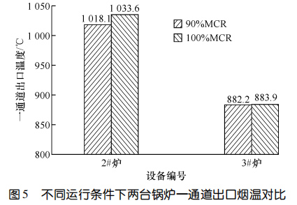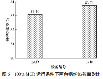兩臺設備運行 11 個月后進行了能效測試。圖5對比了 90%鍋爐大的連續(xù)蒸發(fā)量(簡稱 MCR)和MCR 條件下鍋爐一通道的出口煙溫。圖6示出了MCR運行條件下兩臺鍋爐熱效率的對比。結果顯示:在 90%MCR 運行條件下,3#爐一通道出口煙溫比2#爐低 135.9 ℃,在MCR 運行條件下,3#爐一通道出口煙溫比 2#爐低 149.7 ℃,3#爐的熱效率比 2#爐高 0.64%。相較而言,使用膜式壁爐襯的3#爐在負荷相當?shù)那闆r下,余熱鍋爐熱效率更高。