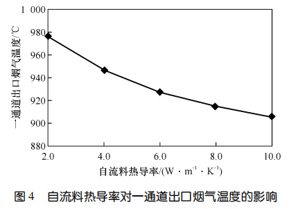 SiC 自流料熱導率對一通道出口煙氣溫度的影響圖4示出了自流料熱導率對一通道出口煙氣溫度的影響??梢钥闯觯瑺t襯各工作層厚度固定時,一通道出口煙氣溫度隨自流料熱導率的升高而降低。通過調整自流料熱導率,一通道出口煙氣溫度差值高達 70 ℃。