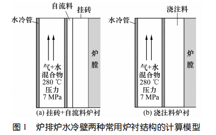 采用有限元分析軟件ANSYS的流體模塊FLUENT對國內外爐排爐常用的兩種水冷壁內襯結構內部的溫度分布進行數(shù)值模擬分析。膜式壁結構(掛磚+自流料)和水冷管錨固釘+澆注料兩種爐襯結構的計算模型如圖1所示。