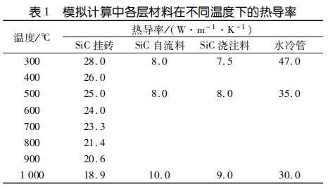 水冷壁內襯的熱傳導性能需要與爐況相匹配,既要盡可能多地將熱量傳導出去發(fā)電,又要保證一通道出口溫度不低于 850℃。模擬計算設定耐火材料熱導率恒定,暫不考慮使用過程中耐火材料組成變化對熱導率的影響和爐襯表面積灰對爐襯熱傳導的影響也不考慮掛釘和錨固釘對熱傳導的影響。進行模擬計算時,水冷壁內襯各工作層選取的熱導率見表1。