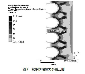 焚燒爐余熱發(fā)電鍋爐水冷壁配置厚度70 ~ 110mm 耐火可塑料或者澆注料,使用后會出現(xiàn)銷釘頭端面以外的耐火材料分層并脫落,脫落區(qū)域附近有細(xì)小裂紋。根據(jù)圖9 所示水冷爐壁應(yīng)力模擬分析可知,高溫條下,金屬錨固件的熱膨脹大于耐火材料的,在耐火材料與金屬銷釘界面應(yīng)力較大區(qū)域,大量銷釘共同作用使耐火材料產(chǎn)生分層,導(dǎo)致耐火材料脫落。