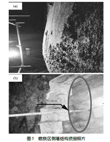 不同焚燒階段,工藝溫度差異較大,各段爐墻受熱不均勻。其中,燃燒段是溫度較高區(qū)域,主要是絕熱爐墻和風(fēng)冷爐墻兩種結(jié)構(gòu),風(fēng)冷爐墻的穩(wěn)定性要明顯好于絕熱爐墻的。但是無論哪種結(jié)構(gòu),服役時(shí)間較長以后,均會出現(xiàn)鼓包凸起。圖5(a)是絕熱爐墻服役一段時(shí)間后爐墻明顯鼓包照片,中心區(qū)域凸起高度達(dá)到200 mm 以上。圖5(b)示出了爐墻服役過程中的風(fēng)冷爐墻,殘余風(fēng)冷爐墻空氣夾層厚度由設(shè)計(jì)的60 mm 擴(kuò)展為120 mm。