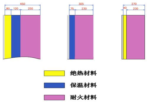 1)方案一,包括耐火材料、保溫材料和絕熱材料; 這種三層結(jié)構(gòu)設(shè)計(jì), 以總厚度450mm為例,外壁溫度為80~90℃。