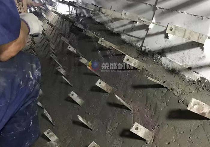 高溫段因需要考慮耐火以及耐磨等因素則采用重質(zhì)澆注料加輕質(zhì)澆注料相結(jié)合的復(fù)合結(jié)構(gòu),鏈篦機(jī)爐頂和高溫段側(cè)墻一般采用錨固磚結(jié)合澆注料的形式,但在高溫段側(cè)墻水平方向上需鋪設(shè)一條托板,這樣做的好處是人為設(shè)置一條膨脹縫,可以較大程度地消除因為膨脹對錨固磚產(chǎn)生的破壞作用。