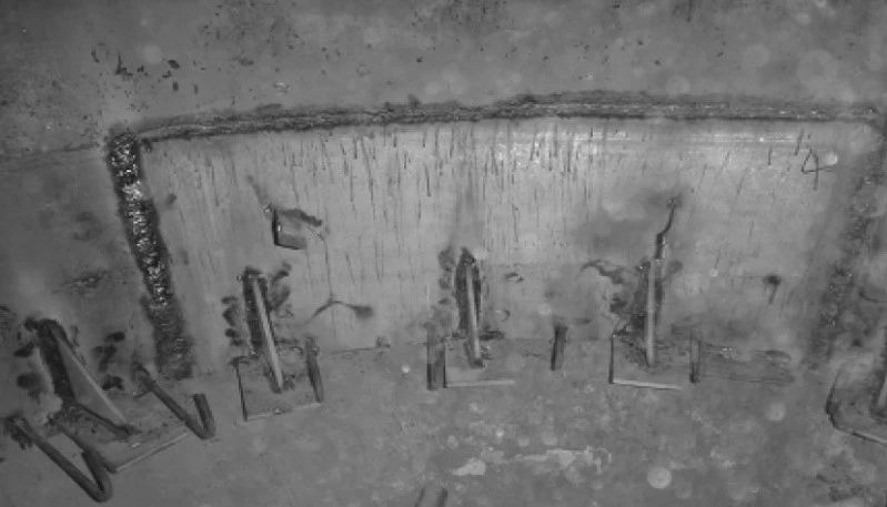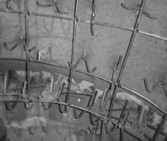 (4)原錨固件為Y銷釘,每隔150mm交錯(cuò)布置,銷釘端部沒有鋼筋網(wǎng)格,使耐火材料無法形成整體,個(gè)別銷釘失效后會(huì)使局部耐火材料松動(dòng),相鄰耐火材料之間沒有可靠聯(lián)系,zui終脫落。