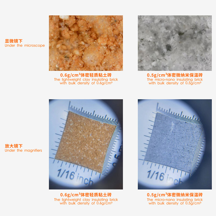將體積密度0.6 g/cm3的普通粘土質(zhì)輕質(zhì)保溫磚和體積密度0.5 g/cm3的新型保溫磚放在顯微鏡下觀察,普通粘土質(zhì)輕質(zhì)保溫磚的氣孔大部分為貫通式氣孔,磚體結(jié)構(gòu)松散,而新型保溫磚的氣孔均為封閉式超低氣孔,結(jié)構(gòu)致密。