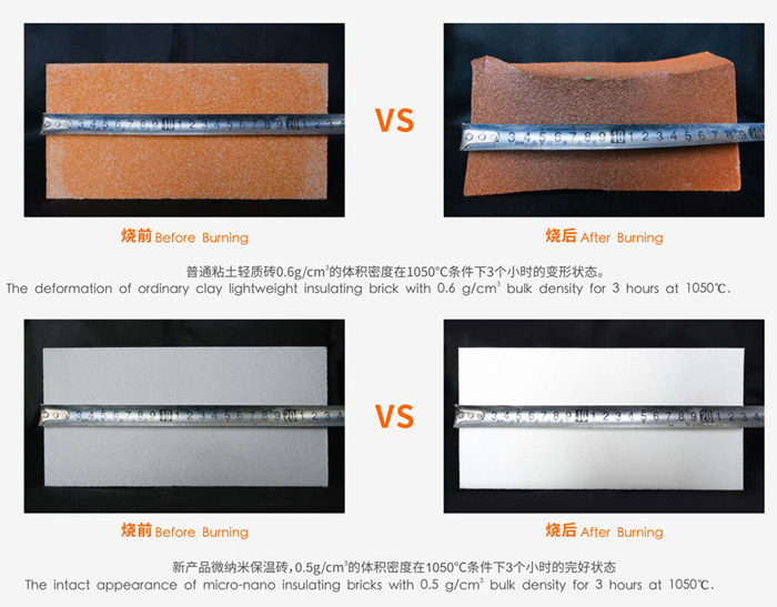將體積密度0.6 g/cm3的普通粘土質(zhì)輕質(zhì)保溫磚和體積密度0.5 g/cm3的微納米保溫磚同時(shí)在1050℃下保溫3小時(shí)燒后,普通粘土質(zhì)輕質(zhì)保溫磚由230mm收縮到190mm,磚體嚴(yán)重變形,而新型保溫磚尺寸未發(fā)生變化,外觀完好。